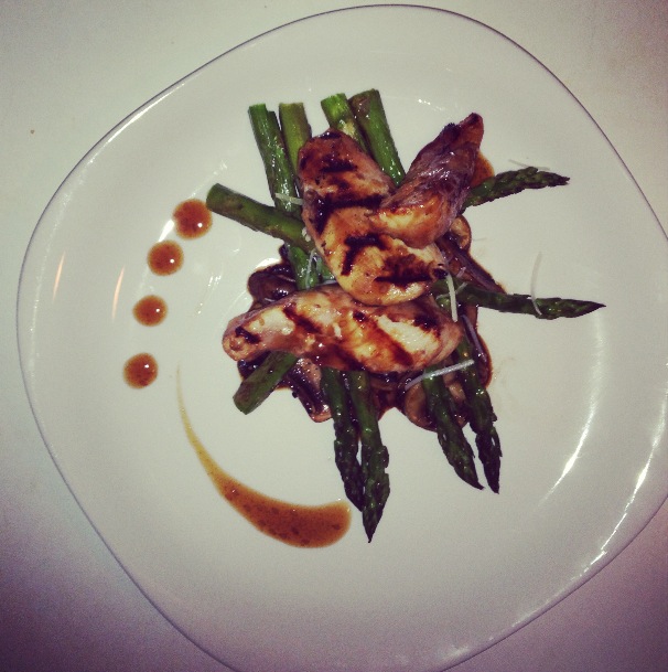 After marinating overnight, I placed chicken over a medium-high heat lightly greased with EVOO, cooking about 5-7 minutes on each sides or until done.  I also placed asparagus on the griddle around the chicken on the untouched areas, rotating every 2-3 minutes.