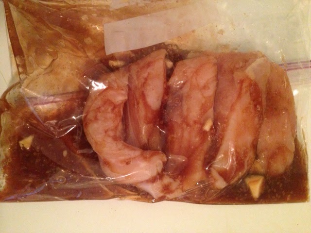 I thinly sliced the chicken breast , placed it a ziplock bag, added in the garlic and the soy ginger vinaigrette  I let it marinate for 24 hours.