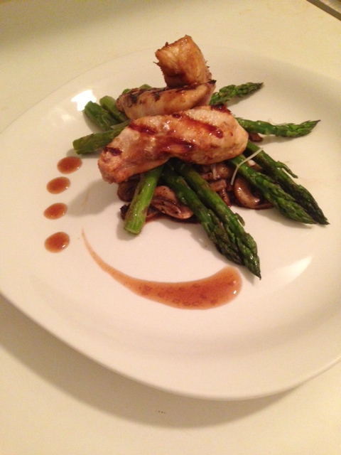 Once it was all done, plate mushrooms, then asparagus, then chicken. After plating, I drizzled fresh soy ginger vinaigrette over chicken and add along the plate for the restaurant flare at home! Bon Apetit!