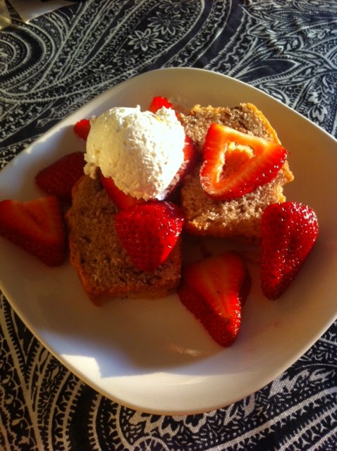 Layer each slice of the loaf on the plate almost in a staggering position and lay the strawberries on top in the same pattern. Add a dollop of cool whip and enjoy!